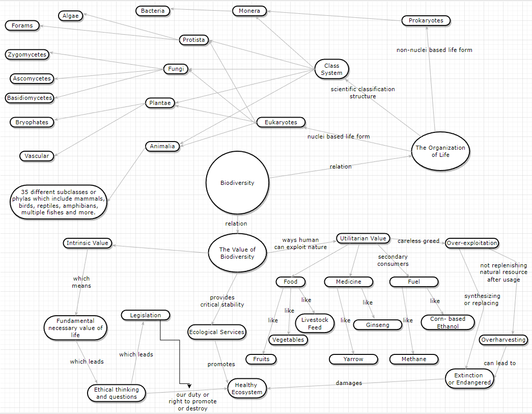 Concept Map of Chapter 7: Biodiversity, informed the reader what is biodiversity, its value to human societies and wildlife, and scientific classification system to organize and label life forms.